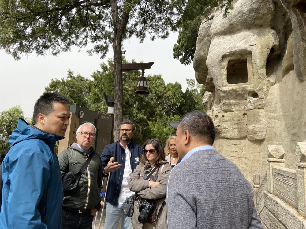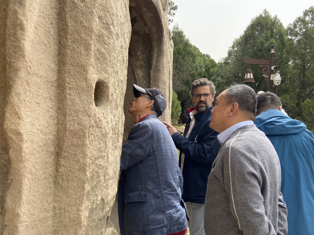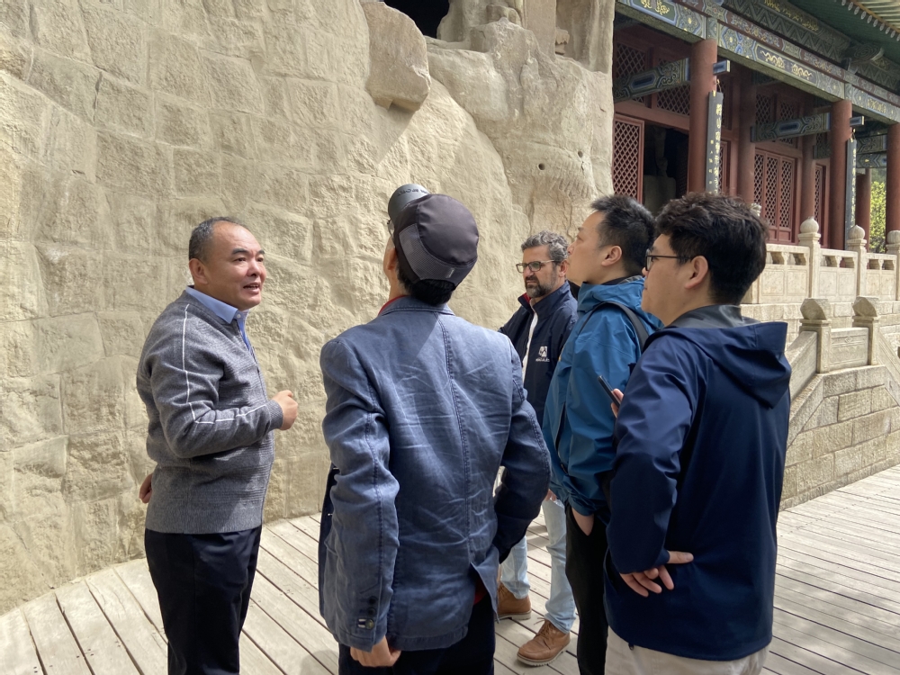 4月20日上午,联合实验室本部和埃武拉团队赴联合实验室山西研究基地交流。在太原理工大学艺术学院赵慧教授和郭文杰教师的陪同下,António Candeias教授和吴尧教授一行人来到位于山西太原市西南40公里的天龙山石窟进行调研考察,并就文化遗产三维仿真技术和数字复原技术展开交流探讨。