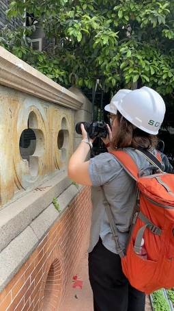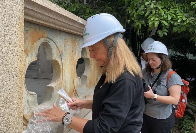 联合实验室(埃武拉)团队指导学生使用手持X射线荧光光谱仪(XRF)、便携式硬度计、表面粗糙检测仪、ATP荧光分析仪与新生代定序仪等便携式无损检测仪,对正在修缮的林堂进行采样工作,主要是林堂的天然石材,如入口柱头雕花的焦山石和金山石。之后,埃武拉团队前往苏州天香小筑,对其墙面病害也进行了相应采样检测工作。