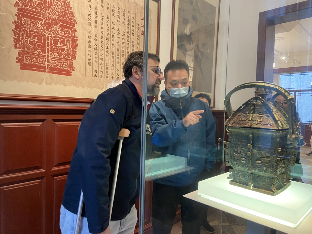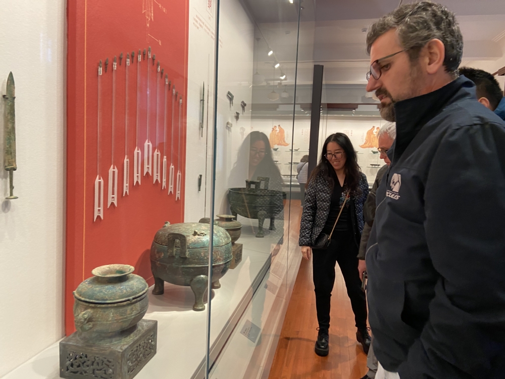 山西督军府旧址,原为晋文公重耳庙,是中国保存下来较完整的督军府旧址之一,2019年被列入第八批全国重点文物保护单位。两位老师向António Candeias教授介绍了太原市针对督军府旧址组织实施的综合整治配套工程,包括修缮南大门、渊谊堂、自省堂等历史建筑,并依据相关历史文献资料修建仿古建筑。双方针对馆藏青铜器的锈蚀情况,向负责人提出了保护维修建议,并就传统文物建筑修缮与历史文化传承进行了深入交流。