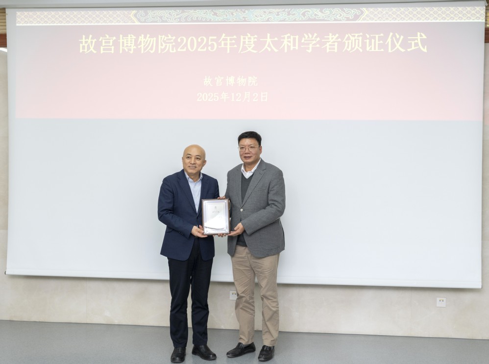 图为澳门文物专家赵强(右)获颁“故宫太和学者”证书。故宫博物院供图
