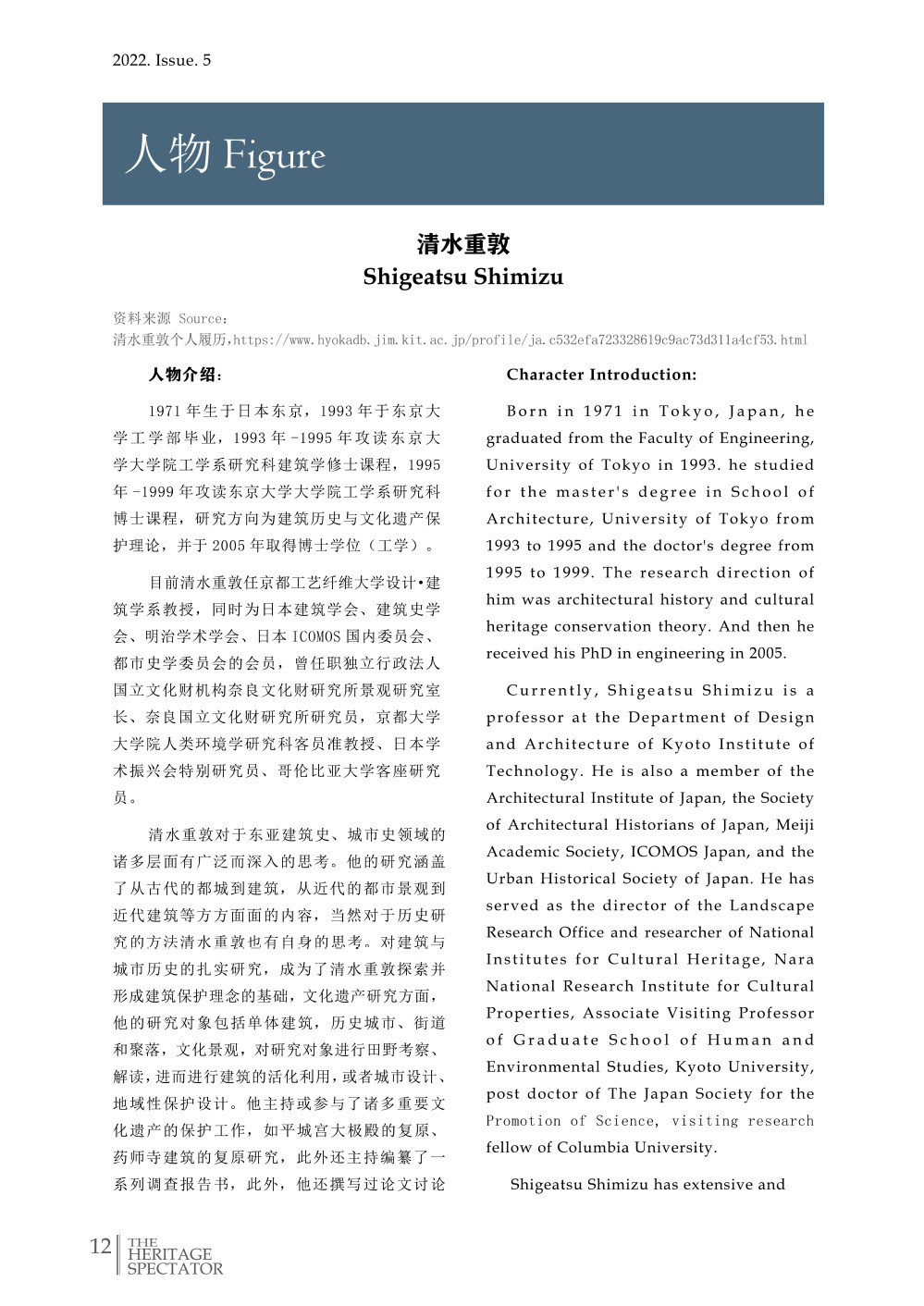 Born in 1971 in Tokyo, Japan, Shigeatsu Shimizu graduated from the Faculty of Engineering, University of Tokyo in 1993. he studied for the master's degree in School of Architecture, University of Tokyo from 1993 to 1995 and the doctor's degree from 1995 to 1999. The research direction of him was architectural history and cultural heritage conservation theory. And then he received his PhD in engineering in 2005.