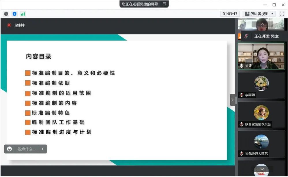 苏州大学建筑学院博士后纪旭、中国历史文化名城苏州研究院院长助理张玲、苏州大学绿色建筑国际研究中心副主任吴捷分别就三项团体标准立项背景和立项依据、意义、编制目的、主要技术内容、编制计划周期及现有工作完成情况等作出汇报。