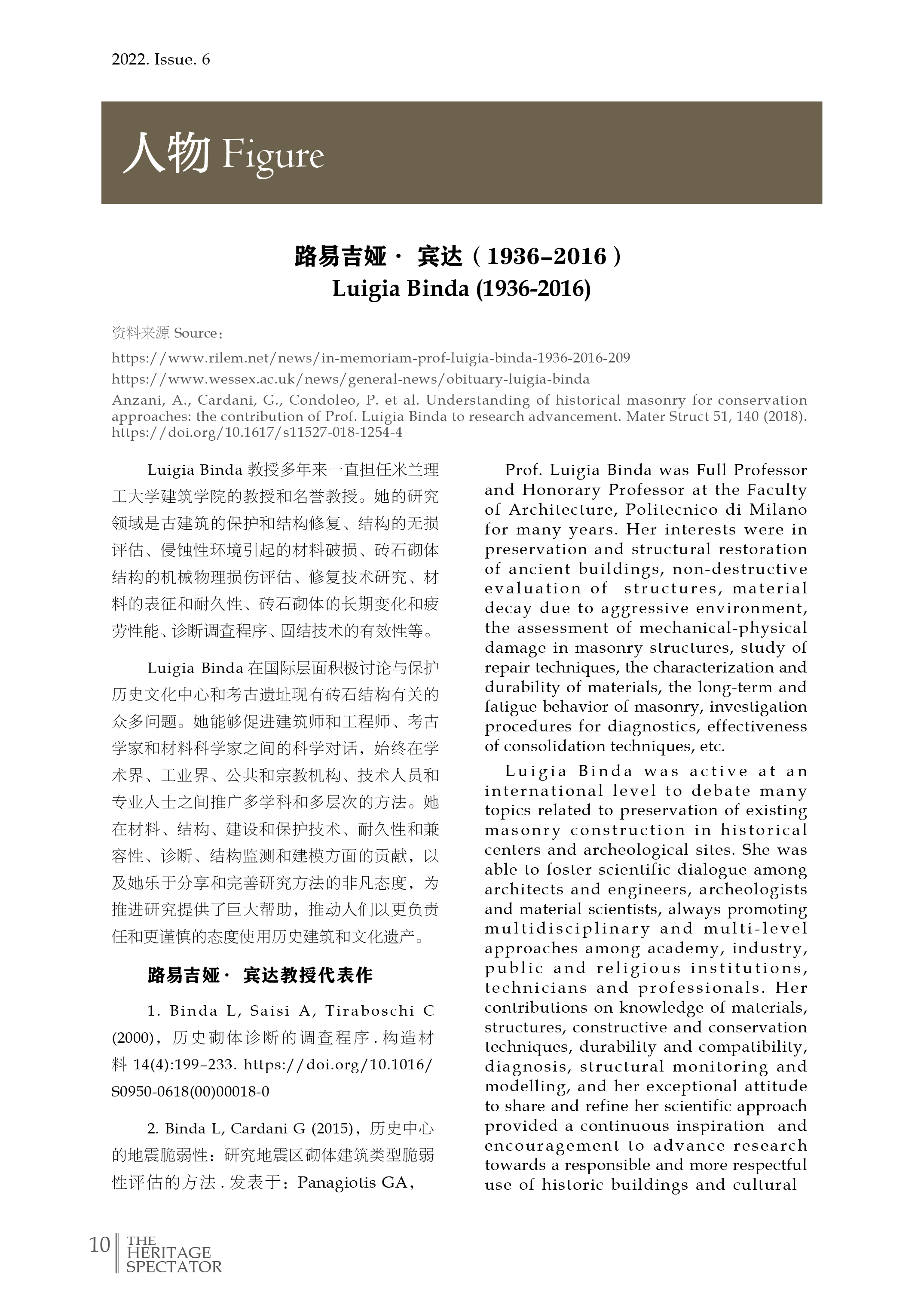 路易吉娅· 宾达教授多年来一直担任米兰理工大学建筑学院的教授和名誉教授。她的研究领域是古建筑的保护和结构修复、结构的无损评估、侵蚀性环境引起的材料破损、砖石砌体结构的机械物理损伤评估、修复技术研究、材料的表征和耐久性、砖石砌体的长期变化和疲劳性能、诊断调查程序、固结技术的有效性等。