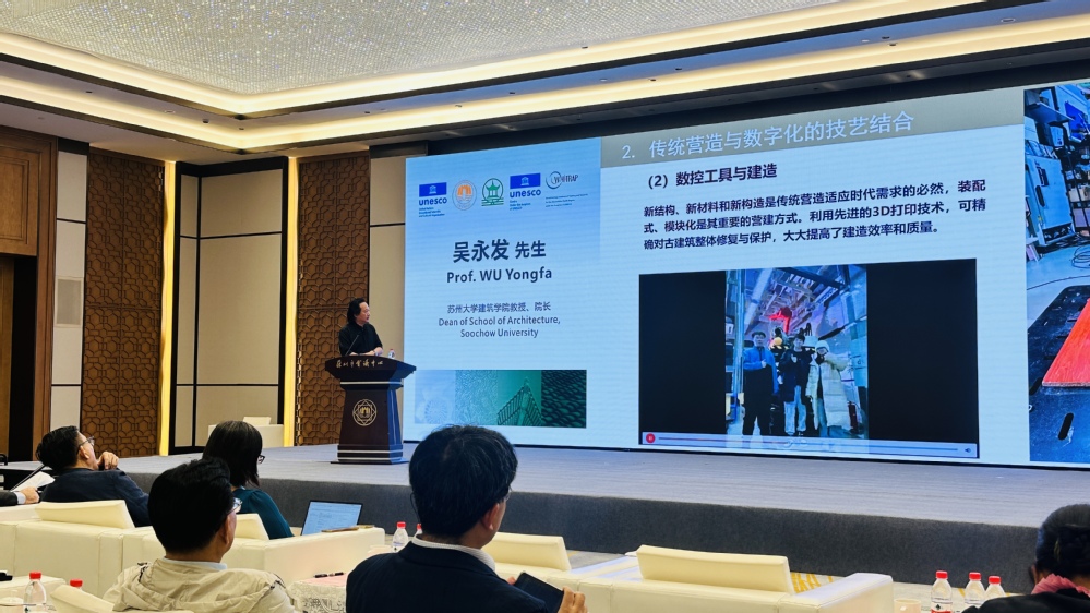 吴永发以“数字赋能,传统营造技艺的新质生产力”为题,围绕传统营造技艺的传承与创新进行专题讲座,并参与“促进可持续生计和经济发展的技能”主题交流。结合联合实验室在文化遗产保护领域的探索实践,分享遗产保护新知识、新技术,探讨文化遗产与经济社会发展的融合机制。呼吁广大青年积极参与文化遗产保护传承,推动文明对话,促进共同繁荣。