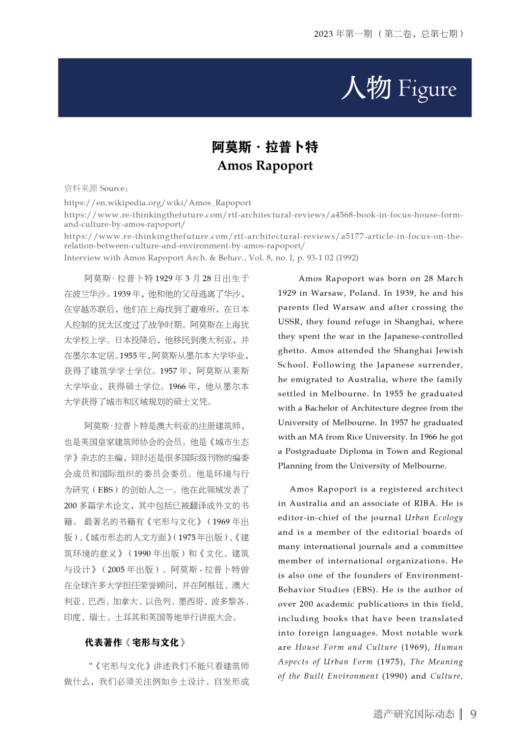 阿莫斯·拉普卜特是澳大利亚的注册建筑师,也是英国皇家建筑师协会的会员。他是《城市生态学》杂志的主编,同时还是很多国际级刊物的编委会成员和国际组织的委员会委员。他是环境与行为研究(EBS)的创始人之一。他在此领域发表了200多篇学术论文,其中包括已被翻译成外文的书籍。最著名的书籍有《宅形与文化》(1969年出版)、《城市形态的人文方面》(1975年出版)、《建筑环境的意义》(1990年出版)和《文化、建筑与设计》(2005年出版)。阿莫斯·拉普卜特曾在全球许多大学担任荣誉顾问,并在阿根廷、澳大利亚、巴西、加拿大、以色列、墨西哥、波多黎各、印度、瑞士、土耳其和英国等地举行讲座大会。