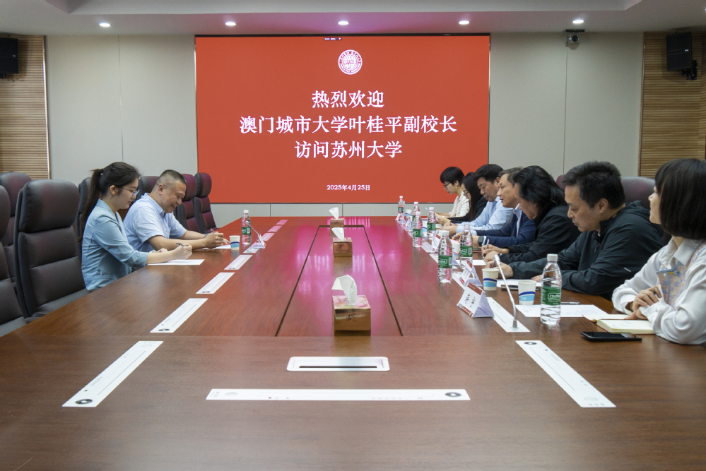 On April 25, Professor Ip Kuai Peng, Vice Rector of City University of Macau, visited Soochow University. Vice President Zhang Zhengbiao of Soochow University hosted the meeting at the DushuLakeCampus. In attendance were Professor Wu Yongfa, Director of the Joint Laboratory and Dean of the School of Architecture; Professor Zhang Jinping, Dean of the Graduate School; Professor Wu Yao, Deputy Director of the Joint Laboratory and Vice Dean of the School of Architecture; Zhang Xian, Deputy Director of the Human Resources Office; Zi Hong, Deputy Director of the International Office; and Jiang Yu, Vice President of the Institute of Scientific Research.