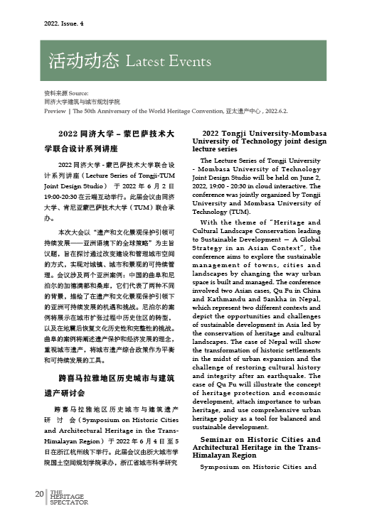 2022同济大学-蒙巴萨技术大学联合设计系列讲座于2022年6月2日19:00-20:30在云端互动举行。本次大会以“遗产和文化景观保护引领可持续发展——亚洲语境下的全球策略”为主旨议题,旨在探讨通过改变建设和管理城市空间的方式,实现对城镇、城市和景观的可持续管理。