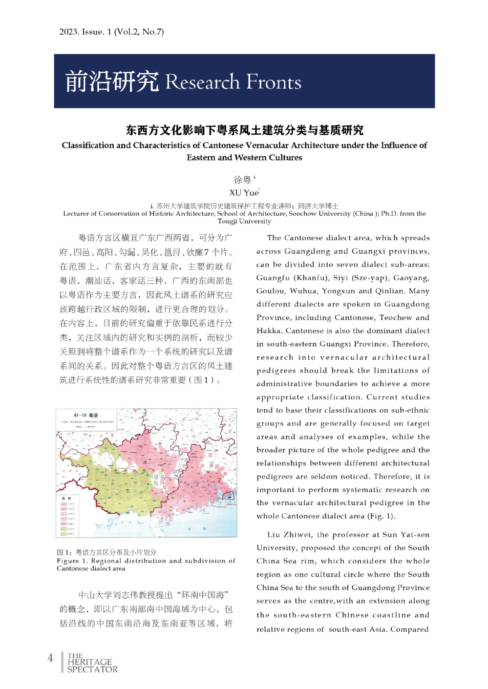 The Cantonese dialect area, which spreads across Guangdong and Guangxi provinces, can be divided into seven dialect sub-areas: Guangfu (Khanfu), Siyi (Sze-yap), Gaoyang, Goulou, Wuhua, Yongxun and Qinlian. Many different dialects are spoken in Guangdong Province, including Cantonese, Teochew and Hakka. Cantonese is also the dominant dialect in south-eastern Guangxi Province. Therefore, research into vernacular architectural pedigrees should break the limitations of administrative boundaries to achieve a more appropriate classification. Current studies tend to base their classifications on sub-ethnic groups and are generally focused on target areas and analyses of examples, while the broader picture of the whole pedigree and the relationships between different architectural pedigrees are seldom noticed. Therefore, it is important to perform systematic research on the vernacular architectural pedigree in the whole Cantonese dialect area.